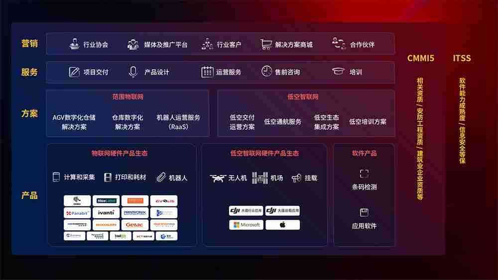 聚合国内外先进的物联网硬件产品品牌,,,,聚焦数字化仓储、、机器人运营、、、、低空智联网等领域,,共同打造适合客户业务场景的解决方案并提供交付服务